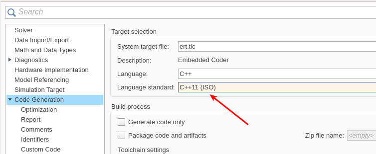 建议选择 “C++11” 选项,以确保与适用于 NVIDIA Jetson 和 NVIDIA DRIVE 平台的 MATLAB Coder 支持包的兼容性。